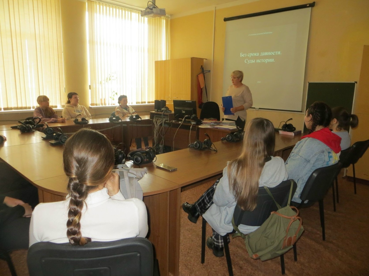 7 октября в библиотеке прошел час истории «Без срока давности. Суды истории». Участниками стали учащиеся старших классов Солнечной школы. Ребята узнали о трех крупнейших судебных процессах над нацистскими и японскими военными преступниками. О военных преступлениях и сущности обвинений, о результатах и мировом значении.